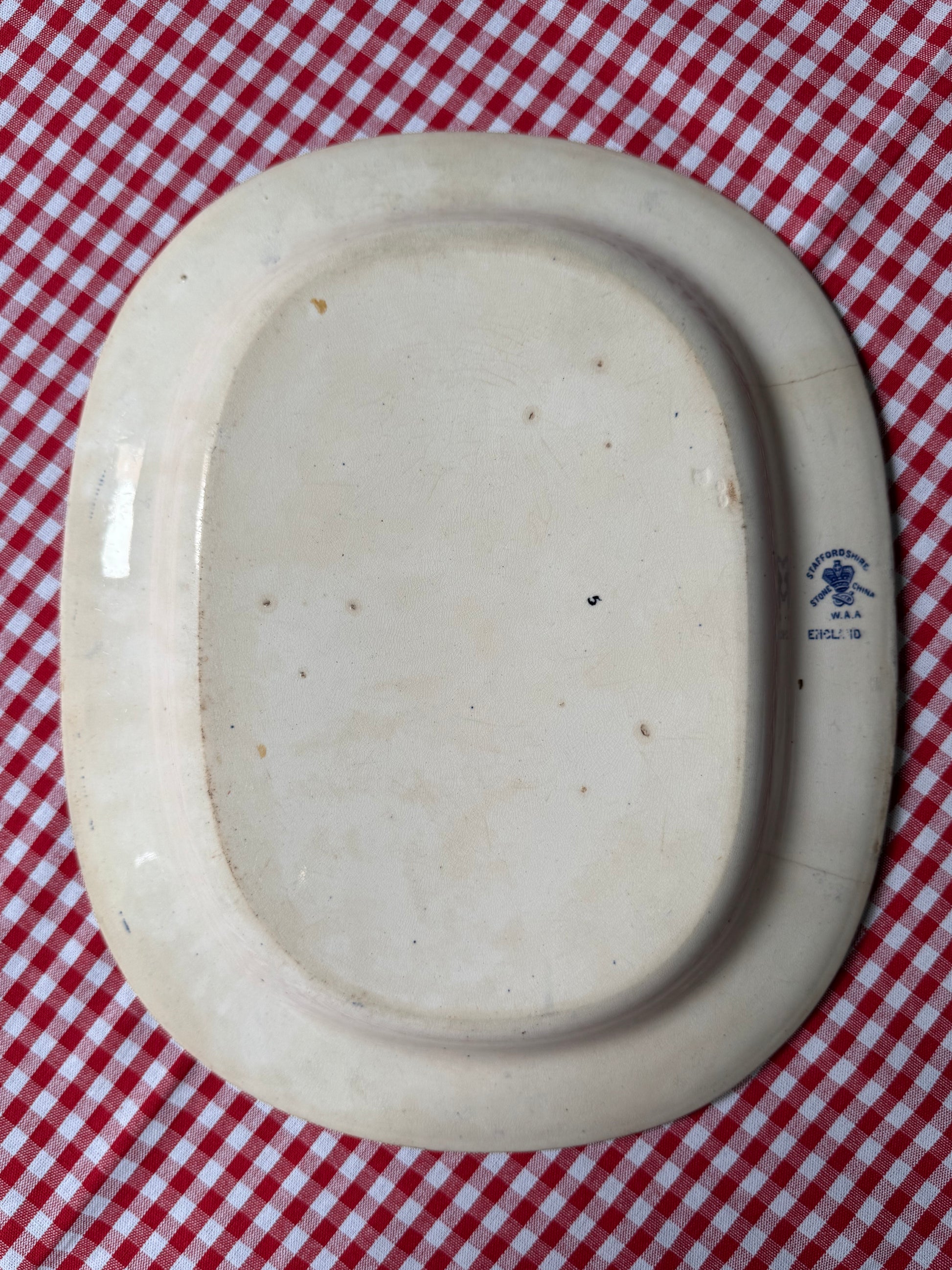Late 19th century Blue Willow ironstone platter by William Alsager Adderley & Co (WAA) of Staffordshire, England. *Vintage wear includes two hairline cracks as pictured on backside.