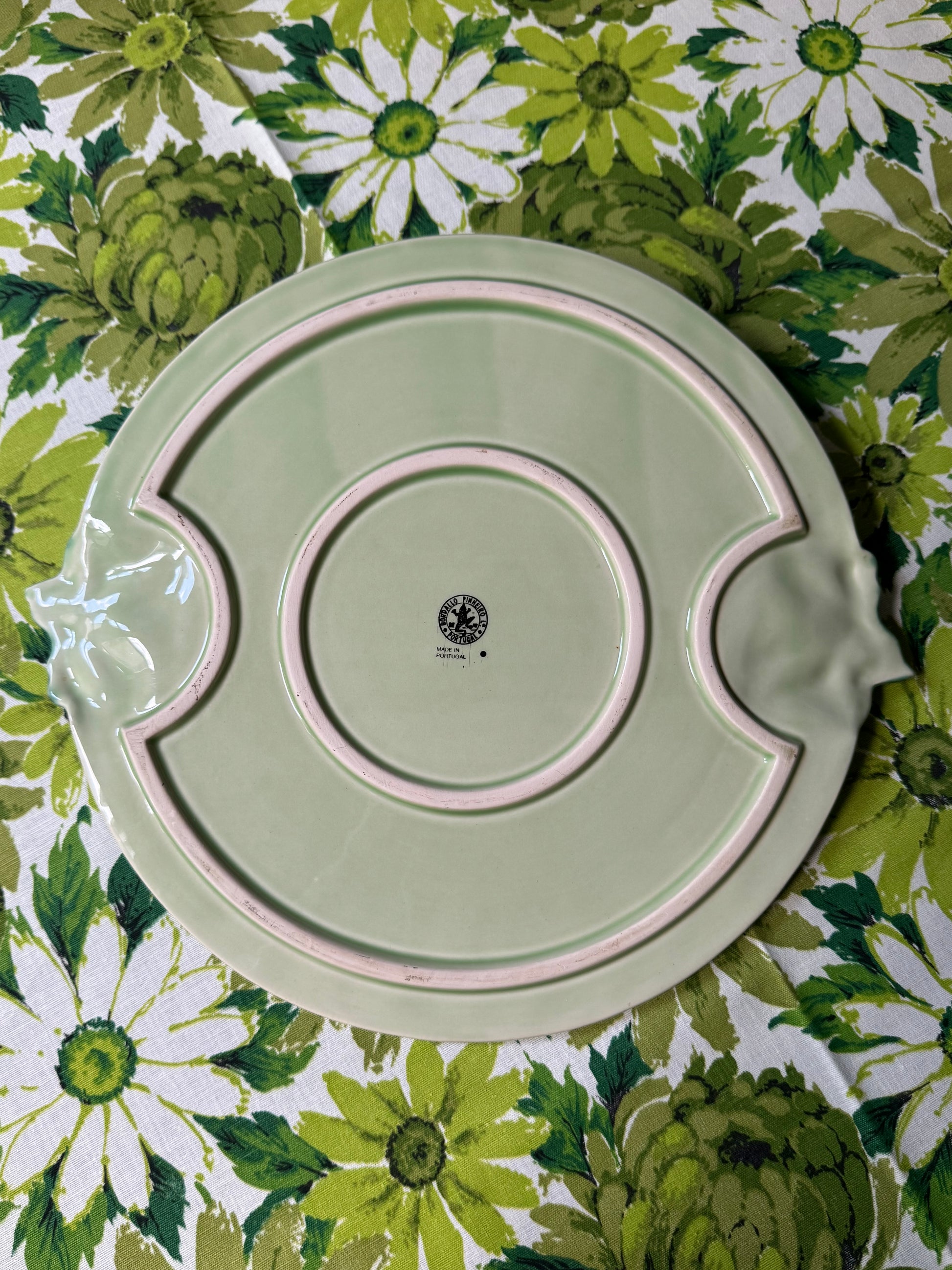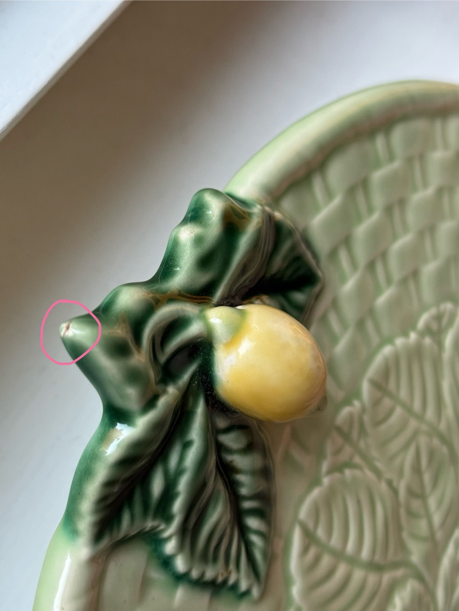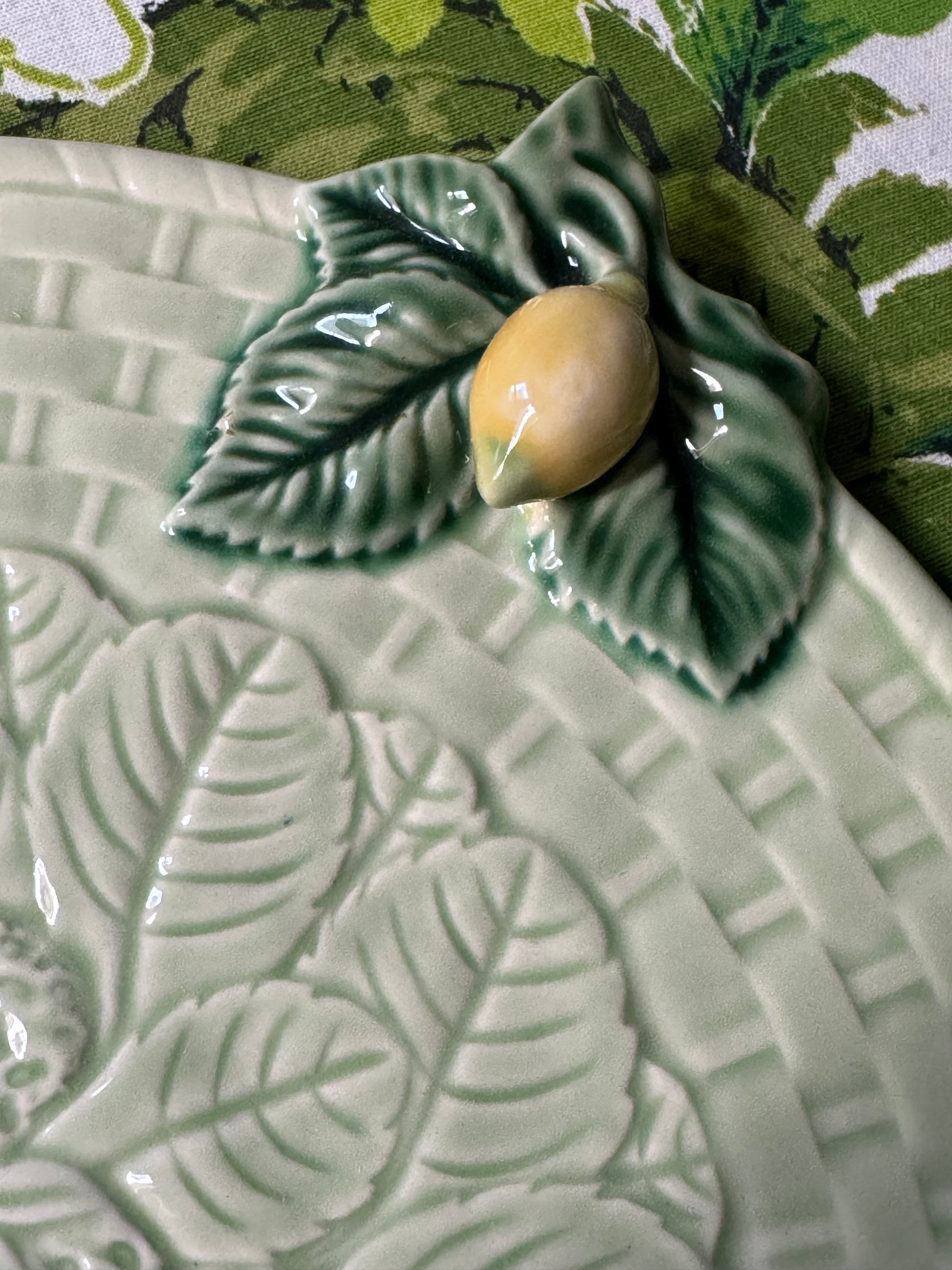 Hand-painted round earthenware platter with lemon handles and basketweave details. Made in Portugal by Bordallo Pinheiro. Use as a cheese tray or pie plate. Diameter of platter is approximately 12.5”. Measures 14.5” wide from handle to handle.