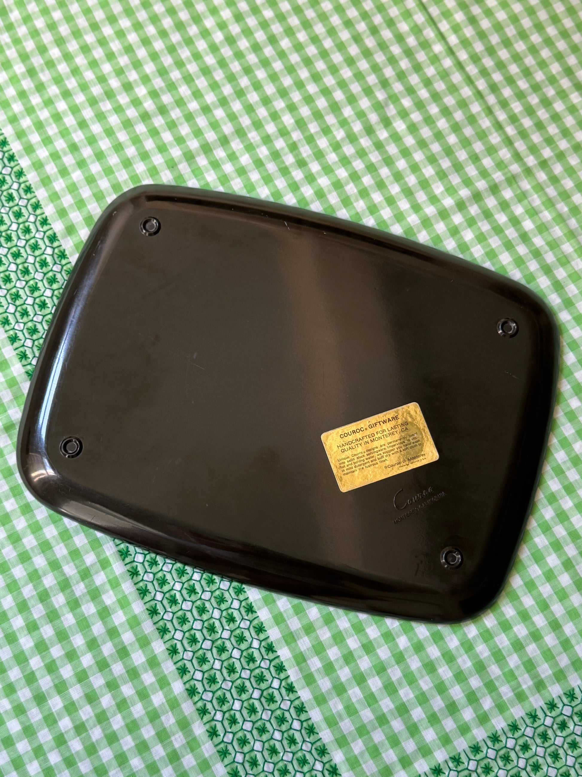 Based in Monterey, California, The Couroc Company was known for its collectible resin trays and barware which were inlaid with natural materials and sold in high end department stores for over forty years. Since each Couroc piece is inlaid by hand, no two pieces are exactly the same.