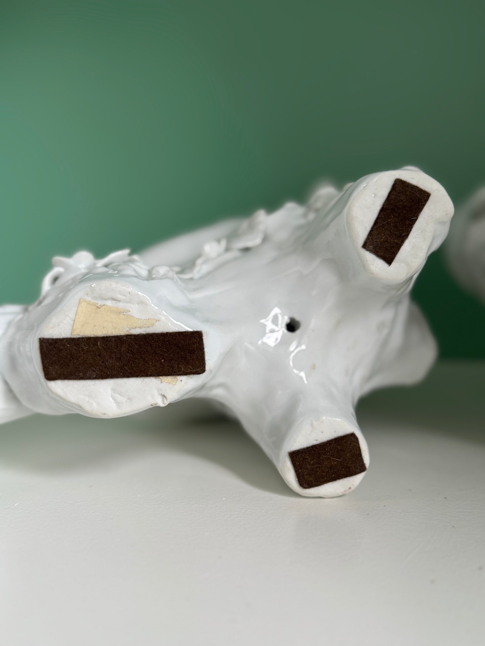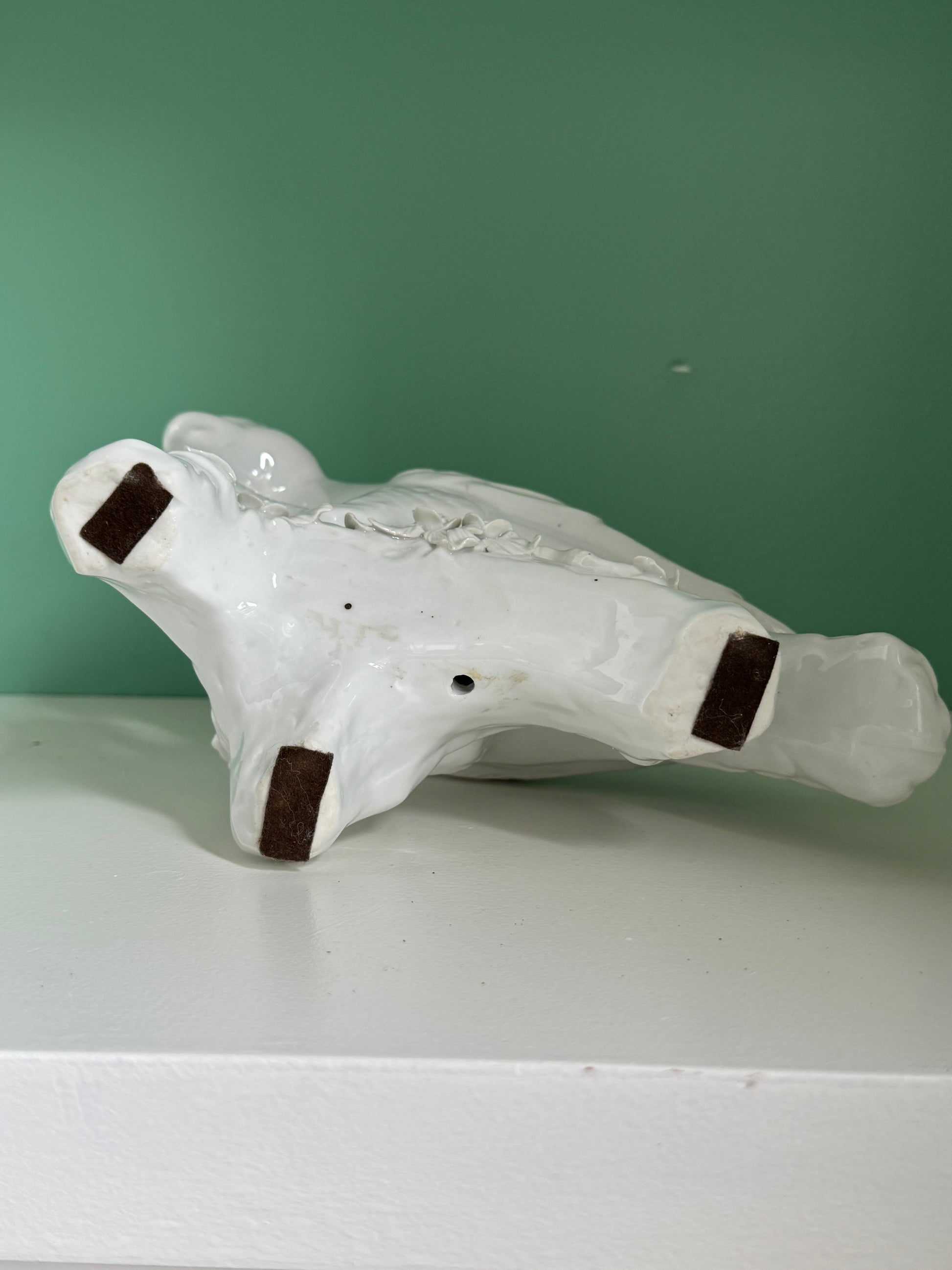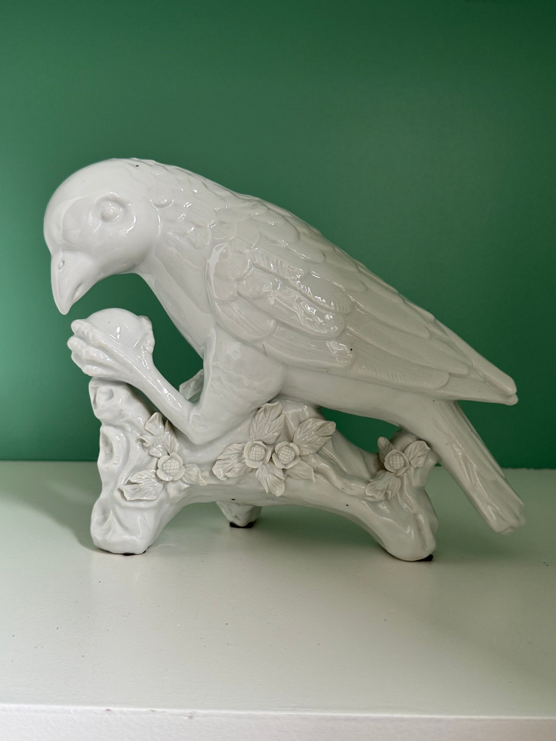 Fabulous pair of glazed “blanc de chine” ceramic bird statues with ball and claw detail.