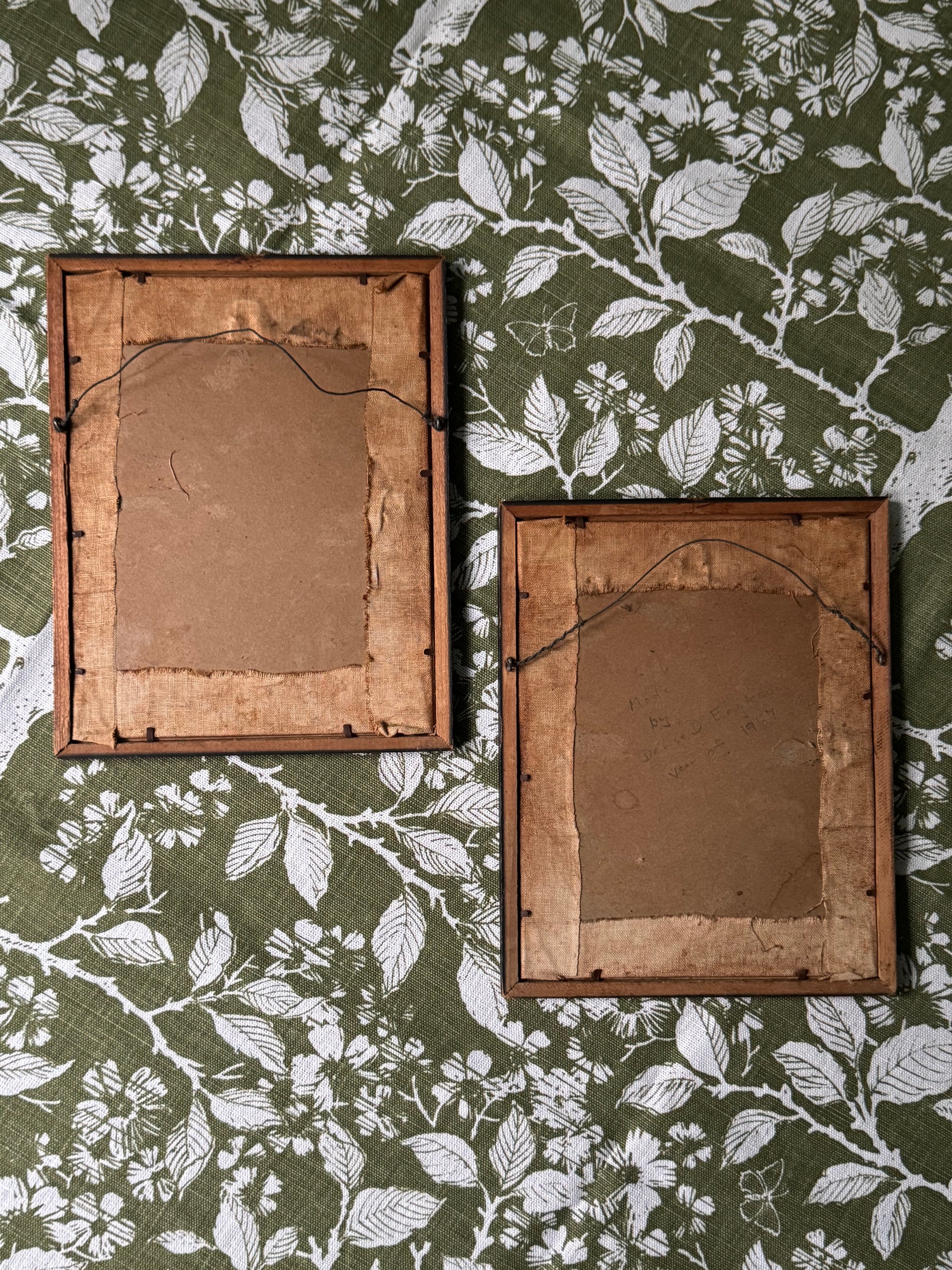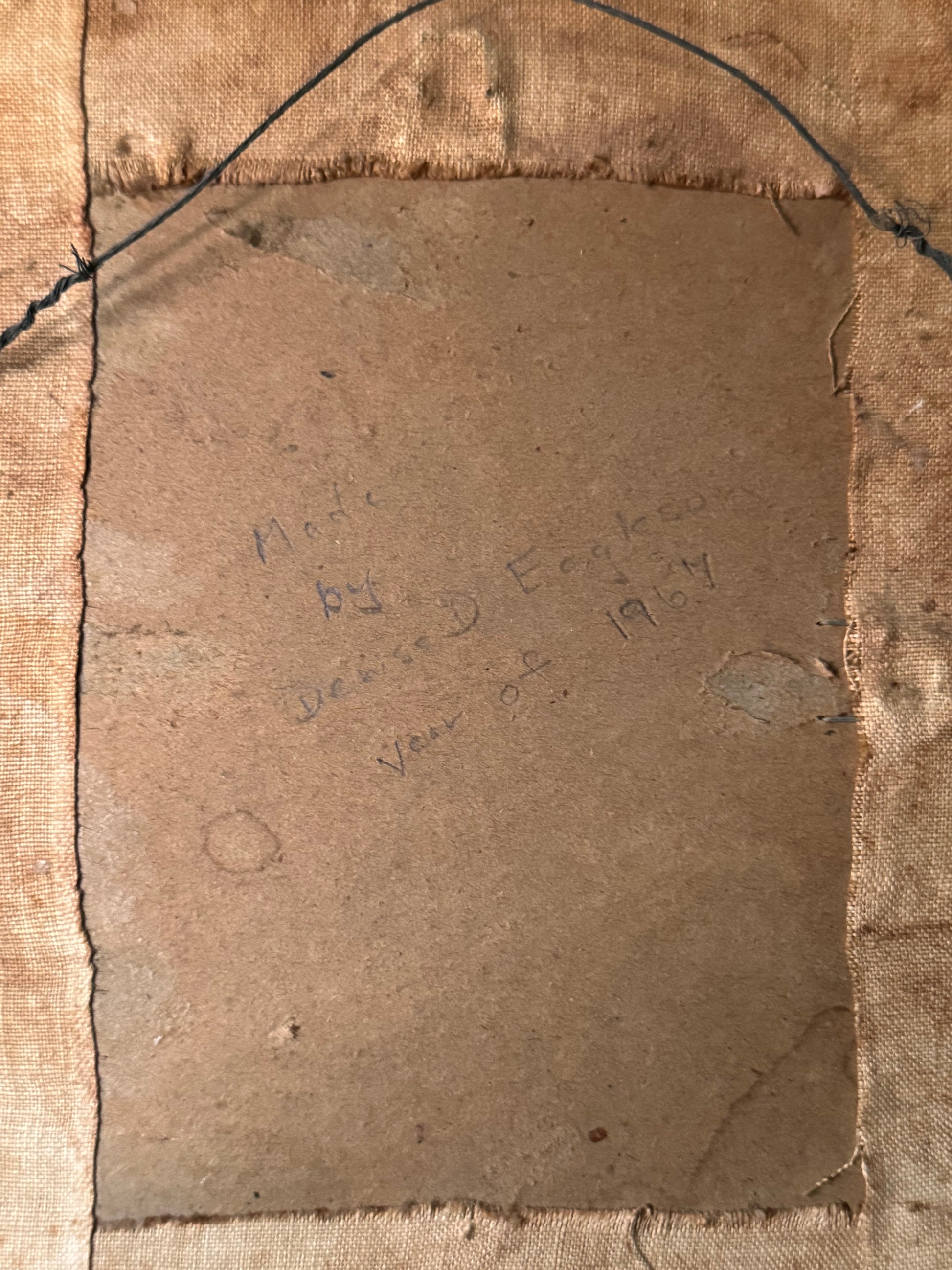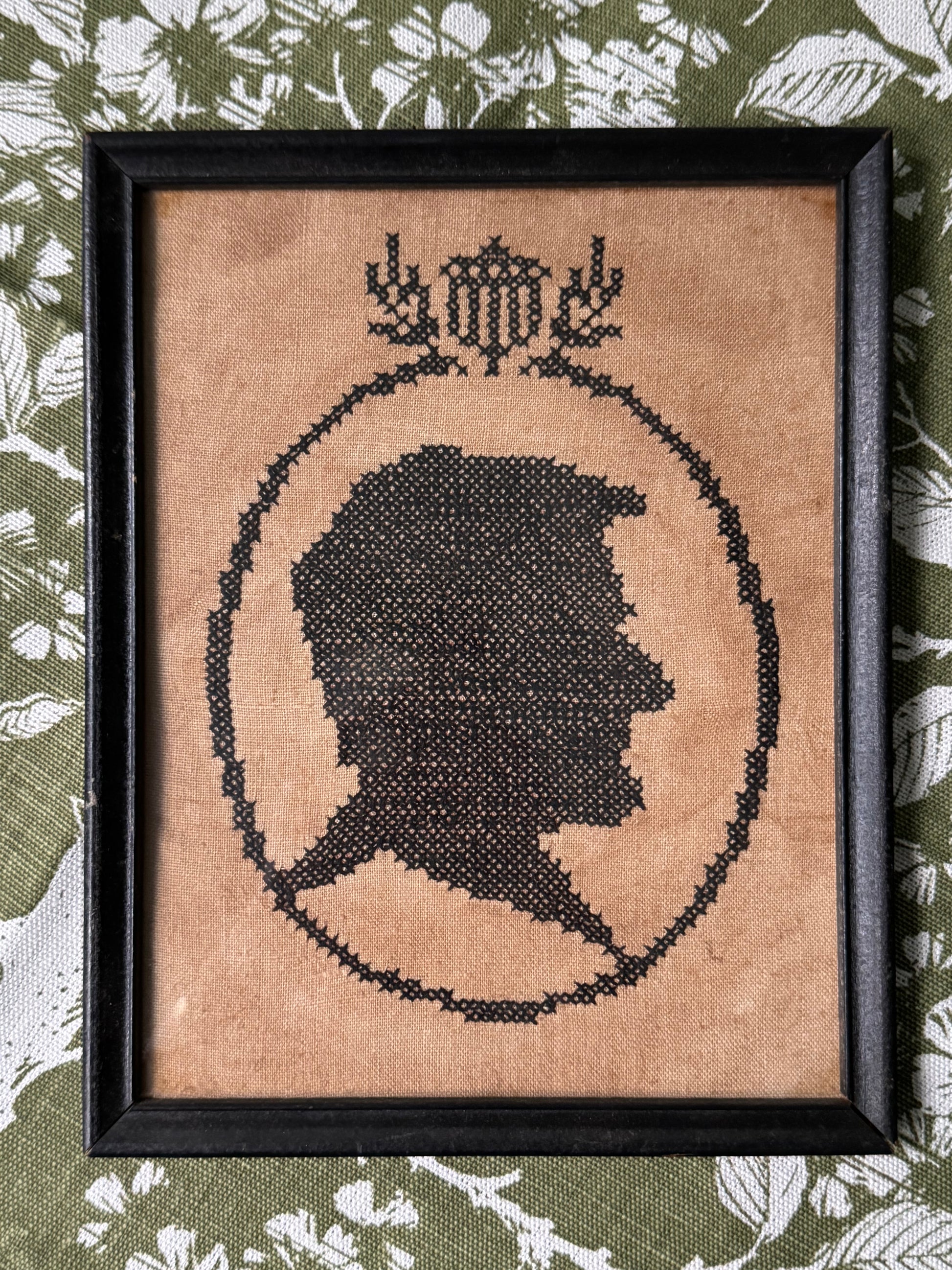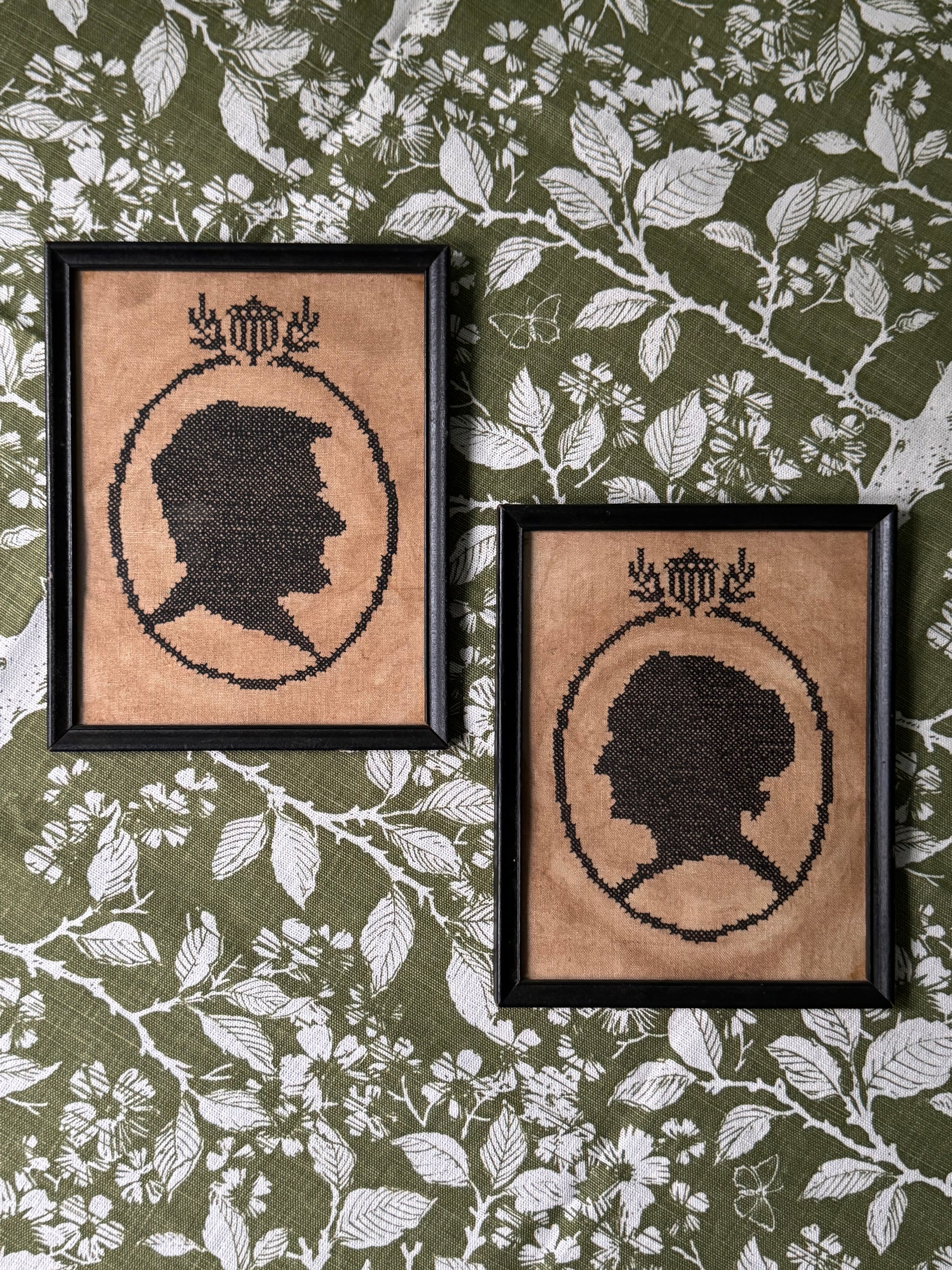 Vintage pair of cross-stitched silhouettes on linen in matching black frames. Backside signature reads “Made by Denise D. Eagleson Year of 1967.”