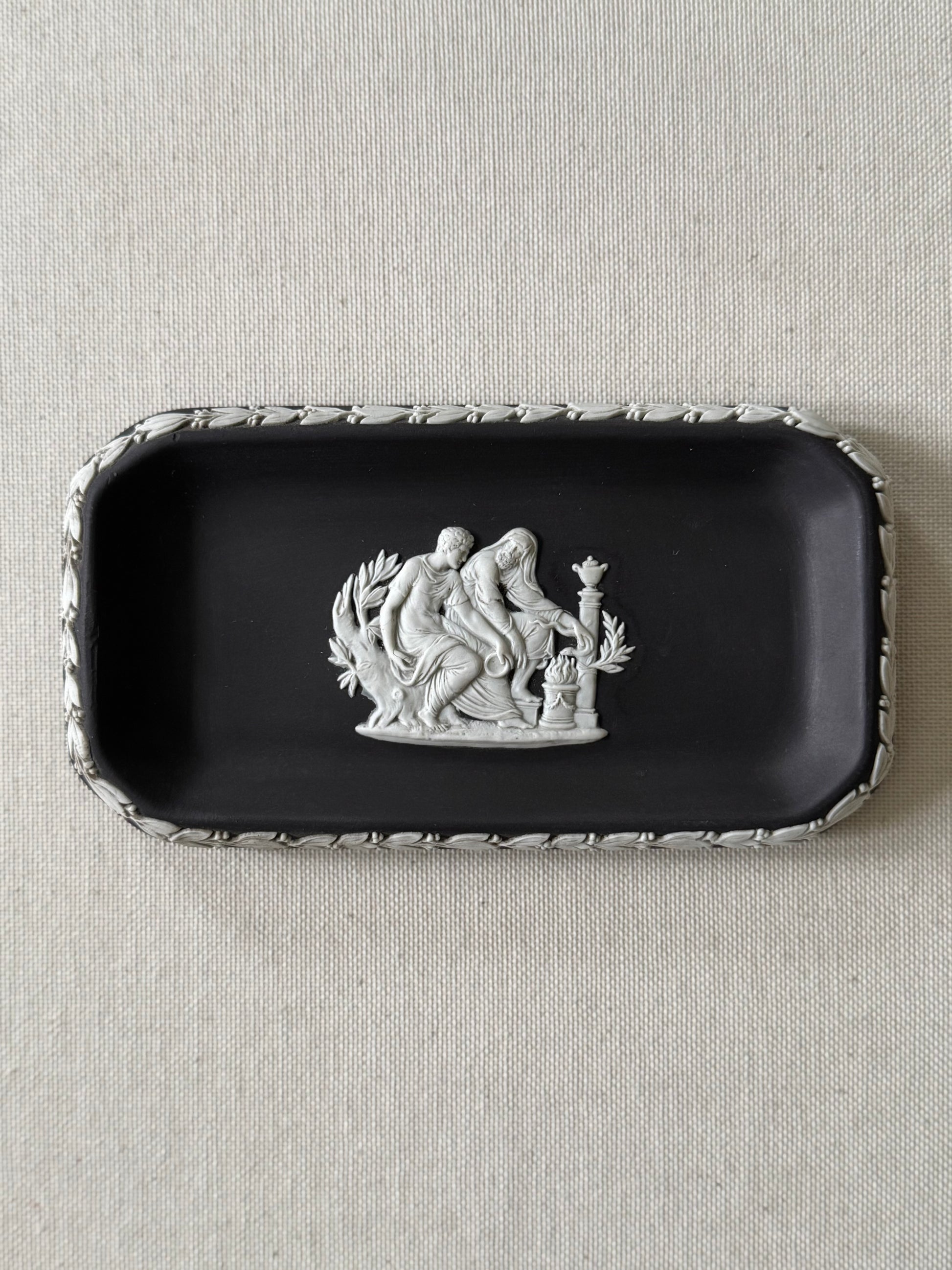 Black and white rectangular Wedgwood jasperware dish with two figures in central scene.