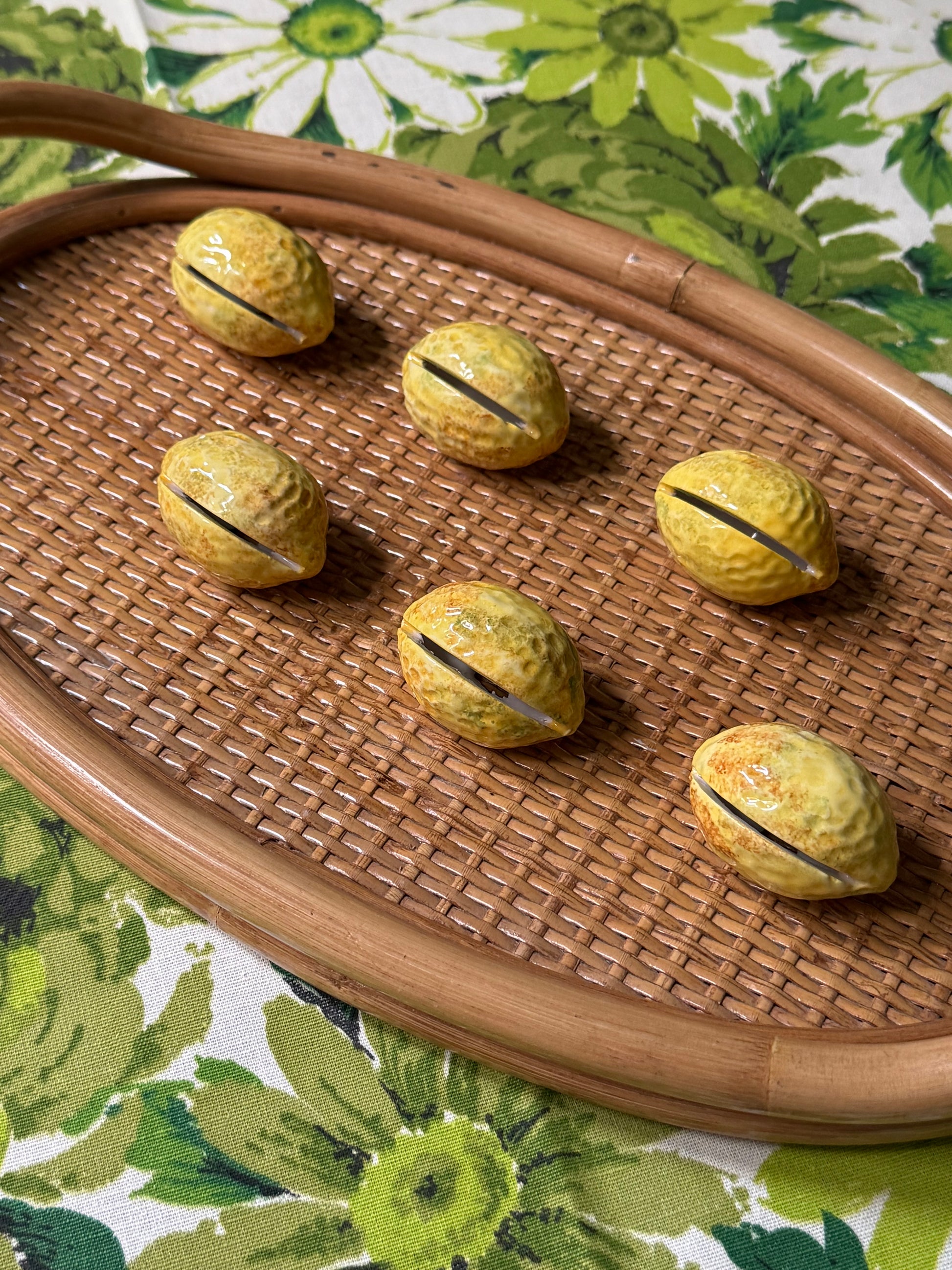 Set of 6 handpainted ceramic lemon placecard holders. There are subtle variations between each lemon as they are handmade. Each lemon measures approximately 2” wide by 1.5” tall.