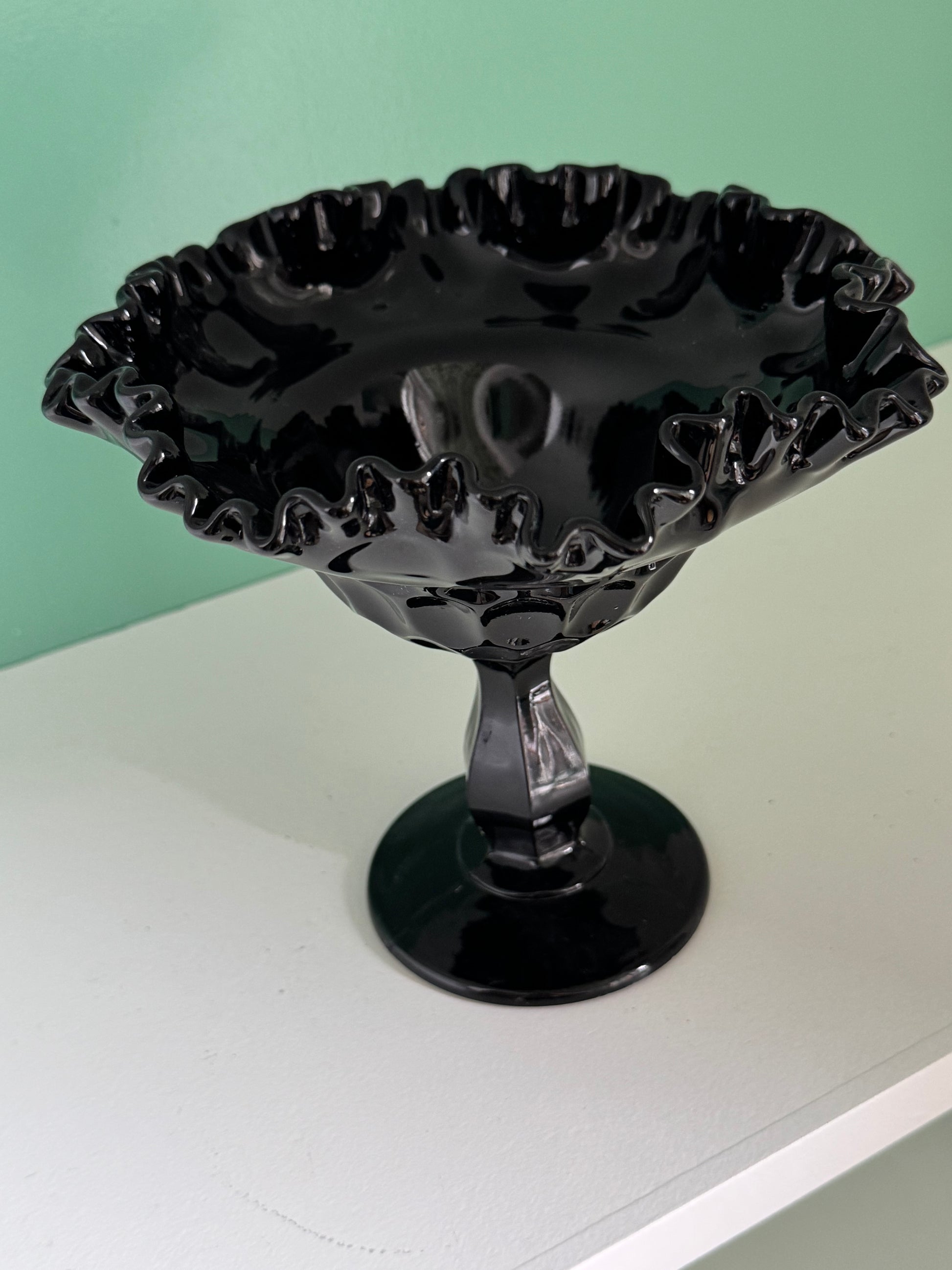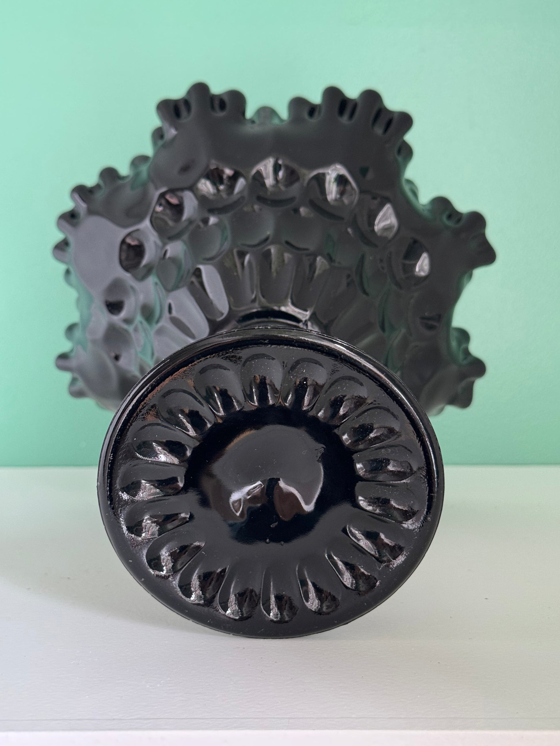 Vintage black ruffle glass thumbprint compote/candy dish by Fenton.